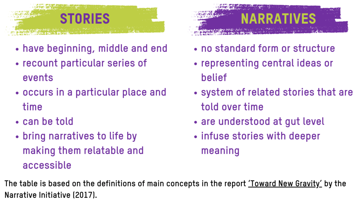 A narrative isn’t just one story, it is a whole system made of frames and stories that connect around a central idea or belief. When those stories get repeated again and again, the narrative becomes familiar, powerful, and we often accept it as truth and reality.